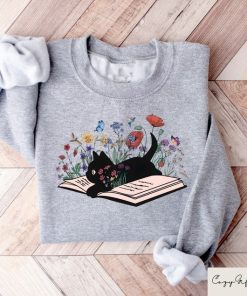 Custom Digital Prints – Cute Floral Cat Sweatshirt, Bookish Sweatshirt, Book Lover Shirt, Gift for Cat Lover, Librarian Gift, Floral Cat Shirt